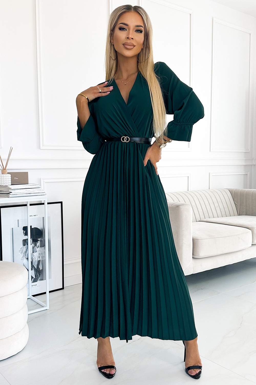 Serena pleated dress with neckline, black belt and 3/4 sleeves, made of smooth green fabric. A perfect dress for any occasion. Brand numoco basic. European production.